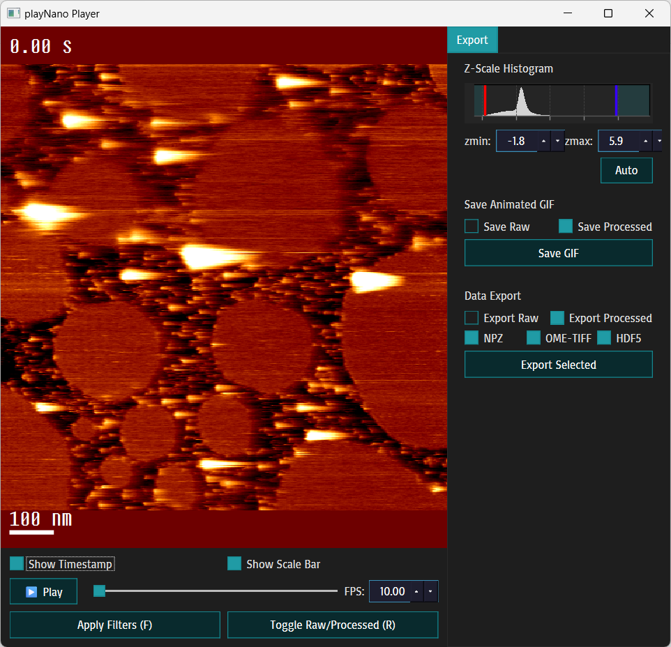 --scale-bar-nmto0) to remove the scale bar.Choose Save Raw or Save Processed in the GIF export panel to pick the data source. - The RAW label that appears in the viewer when raw data is selected is not included in the GIF.